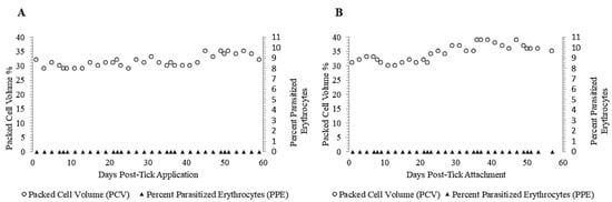 PPE and PCV over time, Calves 2 (A) and 3 (B). In both calves, no parasites were detected during the 60-day monitoring period post-tick application, and the PCV remained within the normal range for the entire experiment.