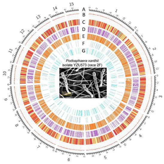 The genomic features of Podosphaera xanthii YZU573 (race 2F). The genome size of isolate YZU573 is 152,748,770 bp. A, Contigs (the top 15 in length are shown). B, GC contents. C, Distribution of the protein-coding genes. D, Distribution of 1778 pathogen-host interaction genes. E, Distribution of the 1724 secreted proteins. F, Distribution of the 191 genes encoding carbohydrate enzymes. G, Distribution of the 499 noncoding RNAs.