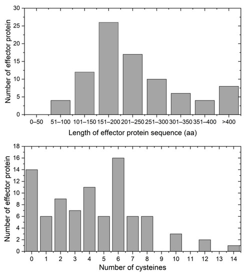 Analysis of amino acid sequences revealed that 79.3% (69 sequences) of P. xanthii. effector proteins were less than 300 aa in length (Figure 4), which is a common feature of effector proteins [41]. In addition, statistical analysis showed that 84 (96.5%) of the putative effector proteins contained 10 or fewer cysteines. Notably, 14 putative effector proteins lacked cysteines entirely, which included 11 cytoplasmic effectors, 2 apoplastic effectors, and 1 apoplastic/cytoplasmic effector (Figure 4). Cysteine content is typically applied to identify candidate apoplastic effectors, as high number of cysteines present in fungi likely form the disulfide bonds that appear to enhance effector stability in the apoplastic environment [42]. However, Huang et al. [43] found an apoplastic effector protein Fs05897 in Fusarium sacchari lacking cysteines entirely also showed the ability to induce plant cell death. Thus, the number of cysteines cannot be used as the sole criterion by which to identify effectors from fungal secretomes.
