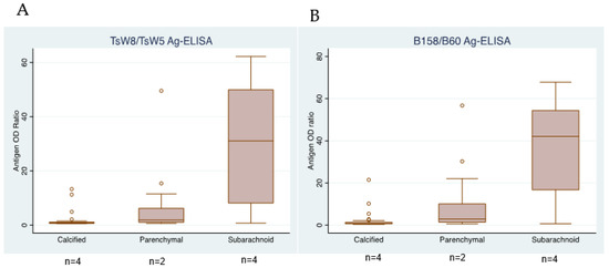 Boxplots showing the antigen OD ratios for each Ag-ELISA (A,B) in patients according to the type of NCC.