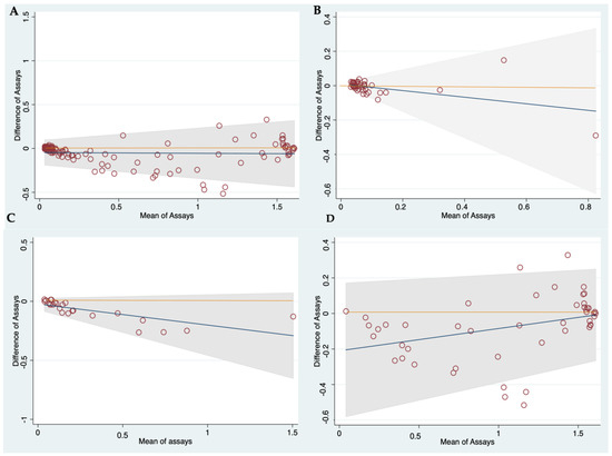 The BA plot across all patients showed that 90.3% (102/113) of the paired log-OD differences between assays were within the LoA, with a regression line of paired differences (mean bias) very close to the line of perfect agreement (mean bias = −0.05 ± 0.1) (Figure 2A). Stratified analysis according to the type of NCC showed that 100% of the paired differences between assays were within the LoA in patients with viable parenchymal and calcified NCC, as were 89.6% (43/48) of the samples from patients with subarachnoid NCC (Figure 2A–D).