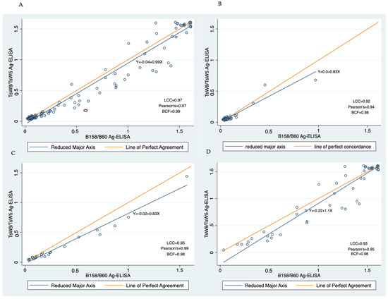Scatter plots showing regression lines of log-OD values between Ag-ELISA’s with corresponding coefficients and 95% confidence intervals (blue line) versus the identity line (orange line). (A) All patients; (B) Calcified parenchymal NCC; (C) Viable parenchymal NCC; (D) Subarachnoid NCC.