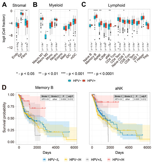 - Oguejiofor, K.; Hall, J.; Slater, C.; Betts, G.; Hall, G.; Slevin, N.; Dovedi, S.; Stern, P.L.; West, C.M.L. Stromal infiltration of CD8 T cells is associated with improved clinical outcome in HPV-positive oropharyngeal squamous carcinoma. Br. J. Cancer 2015, 113, 886–893. [Google Scholar] [CrossRef]