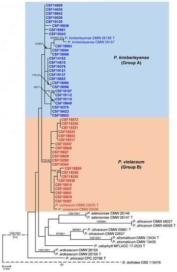 The ITS, tef1, and tub2 loci were amplified for all 126 isolates (Table 2). The sequence fragments were approximately 520 bp for ITS, 280 bp for tef1, and 430 bp for tub2. Sequence alignments were deposited in TreeBASE (30240). Isolates from other studies used for phylogenetic analyses were shown in Table 3. According to the phylogenetic analyses of the ITS, tef1, tub2, and the combined datasets, the isolates in this study (Group A and Group B) were most closely related to P. kimberleyense and P. violaceum (Table 2). The sequence similarity of P. kimberleyense isolates in this study with the type of isolate (CMW 26156) were 99.42% to 99.81% for the ITS region, 98.35% to 99.01% for the tef1 gene region, and 99.08% to 100% for the tub2 gene region. The sequence similarity of P. violaceum isolates in this study with the type of isolate (CMW 22679) were 99.42% to 100% for the ITS region, 99.01% to 100% for the tef1 gene region, and 99.54% to 100% for the tub2 gene region. Although they also clustered or were closely related to P. ardesiacum and P. africanum based on the ITS dataset, they separated distinctly with the two species based on tef1, tub2, and combined datasets (Figure 1 and Figures S1–S3). The ITS and tub2 trees showed close relationships among the isolates in this study with species of P. kimberleyense and P. violaceum, and the tef1 and combined trees provided clear results that separated isolates in Group A and Group B from the two known species (Figure 1 and Figures S1–S3). Additionally, some isolates in this study formed an independent clade in the phylogenetic trees, but these clades had poor bootstrap values. Based on the phylogenetic analyses of the four datasets, isolates in Group A and Group B were considered the known species of P. kimberleyense and P. violaceum, respectively.