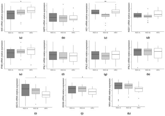Comparison of NRF2 (a), G6PD (b), HO1 (c), NQO1 (d), IFN beta (e), IFNL1 (f), IFNL2 (g), IFNL3 (h), ISG15 (i), ISG56 (j), and MXA (k) gene expression among RSV-A, RSV-B, and HRV infected children. Data are shown as Log10 (2−ΔCt). * p < 0.05, ** p < 0.01.