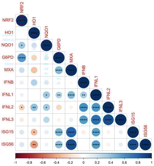Graphical display of the correlation matrix for NRF2, HO1, NQO1, G6PD, MXA, IFN beta, IFNL1, IFNL2, IFNL3, ISG15, and ISG56 levels of expression using the ‘corrplot’ package of the R-software. Spearman’s rank correlations are represented by red (negative correlation) and blue (positive correlation) color gradients. * p < 0.05, ** p < 0.01, **** p < 0.0001.