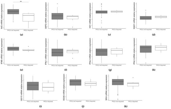 Comparison of NRF2 (a), G6PD (b), HO1 (c), NQO1 (d), IFN beta (e), IFNL1 (f), IFNL2 (g), IFNL3 (h), ISG15 (i), ISG56 (j), and MXA (k) gene expression between children admitted and children not admitted to PICU. Data are shown as Log10 (2−ΔCt). * p < 0.05, ** p < 0.001.