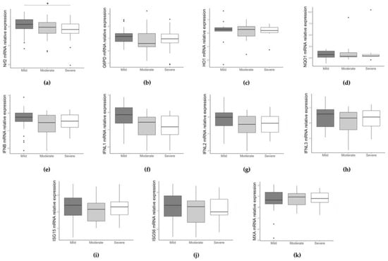 Comparison of NRF2 (a), G6PD (b), HO1 (c), NQO1 (d), IFN beta (e), IFNL1 (f), IFNL2 (g), IFNL3 (h), ISG15 (i), ISG56 (j), and MXA (k) gene expression between children grouped by severity score. Data are shown as Log10 (2−ΔCt). * p < 0.05, ** p < 0.001.