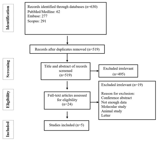 The primary search identified a total of 630 potentially relevant publications. After removing the duplicates, 519 studies were considered for the title and abstract screening, of which 495 irrelevant articles were excluded, and 24 papers were selected for full-text assessment. Finally, five cohort studies met the inclusion criteria and were considered for further meta-analysis (Figure 1).