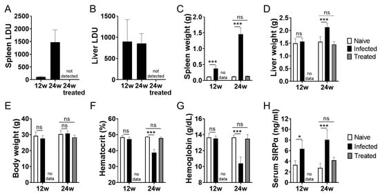 L. donovani infection caused hepatosplenomegaly and anemia in BALB/cA mice as previously reported []. Parasite infection was progressive or sustained over the course of the 24-week infection in the spleen and liver (Figure 1A,B). The spleen and liver of the infected mice at 24 weeks post infection became significantly larger in size than those of uninfected mice, and the infected mice exhibited anemia represented by lower hematocrit and hemoglobin levels (Figure 1C–G). Treatment with AmBisome successfully cleared the parasites in the infected mice and led to clinical improvement represented by reduced spleen and liver sizes, as well as improved hematological parameters (Figure 1A–G). Next, serum levels of SIRPα in naïve, L. donovani-infected, and infected/treated mice were examined using ELISA which detect extracellular regions of SIRPα. As shown in Figure 1H, the increase in serum SIRPα levels became evident as early as 12 weeks of infection, which was before the onset of anemia. In addition, serum SIRPα levels in the treated mice were lower than those of untreated mice and were equivalent to the naïve mice (Figure 1H).