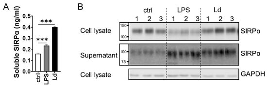 To detect soluble SIRPα in supernatants, 7.2 × 105 RAW264.7 cells were seeded in 6 well plates. After 4 h, wells were washed with serum-free RPMI 1640 and incubated with 100 ng/mL LPS (Sigma) or L. donovani (MOI: 50) in serum-free RPMI 1640 for 24 h. Supernatants were collected and concentrated with Amicon Ultra-0.5 with PLGC Ultracel-10 membrane (Millipore, Germany). Concentrated supernatants were mixed with an SDS sample buffer and boiled for 5 min. The macrophages were also lysed in an SDS sample buffer. The total cellular, soluble, and transmembrane proteins were separated using electrophoresis on acrylamide gel, then transferred to a polyvinylidene difluoride membrane. After blocking the polyvinylidene difluoride membrane with 4% skim milk, the membrane was probed with rat anti-SIRPα extracellular domain (SIRPα-ex) antibodies (P84, eBioscience, San Diego, CA, USA) and rabbit anti-GAPDH antibodies (GeneTex, Irvine, CA, USA), diluted with PBS containing 0.05% Tween 20 (PBS-T) plus 0.4% skim milk. After washing with PBS-T three times, it was probed with horseradish peroxidase (HRP)-linked goat anti-rat IgG antibodies (Invitrogen) or HRP-linked donkey anti-rabbit IgG antibodies (GE Healthcare, Chicago, IL, USA), diluted with PBS-T containing 0.4% skim milk. The bands were visualized using an enhanced chemiluminescence detection system (GE Healthcare) and analyzed with a LAS-3000 mini (Fujifilm, Tokyo, Japan).