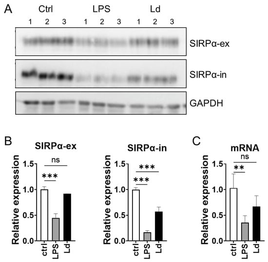 Decrease in C-terminal-competent SIRPα during LPS stimulation and Leishmania infection. (A) RAW264.7cells were incubated with medium only, 100 ng/mL LPS, or L. donovani promastigotes (MOI = 50) in complete RPMI1640. After 24 h, cells were harvested and the cell lysates were analyzed with Western blotting using anti-SIRPα N-terminal antibodies or anti-SIRPα C-terminal antibodies. Data shown are triplicate samples representative of two independent experiments with similar results. (B) Densitometric analyses with ImageJ software showing band intensity for SIRPα detected using anti SIRPα-ex or SIRPα-in antibodies. Mean and SD of triplicates in each group are shown. (C) Expression levels of Sirpa mRNA in RAW264.7 of naïve, LPS stimulation, or L. donovani infection were analyzed using qPCR. ** p < 0.01, *** p < 0.001, ns = not significant with one-way ANOVA followed by Dunnett’s multiple comparison test.