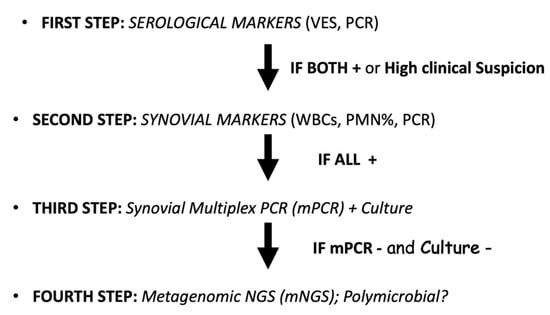 Horriat et al. [], in their review on the efficacy of DAIR in acute and chronic PJIs, showed that an earlier time of surgical intervention was linked to a significant increase in the success rate. The current authors suggest the use of modern, molecular testing technologies (Multiplex PCR and NGS) to improve [,] the timing of making the PJI diagnosis from symptoms onset. This was proposed in order to stop the biofilm development in an early stage, since it has been shown that 72 h are usually needed for the biofilm to be mature []. Time to positivity (TTP) of culture for PJI diagnosis has been, to the authors’ opinion, one of the main factors for the low success rate of many implant saving procedures. Tarabichi et al. [] reported an average of 3.3 days for cultures from PJI to turn positive; Staphylococcus epidermidis and C. acnes were shown to need even more time. To lower the TTP of standard culture, DNA-/RNA-based diagnostic techniques, first developed for the fast diagnosing of SARS-CoV-1 infections, have been recently applied to diagnose musculoskeletal infections in general and PJI in particular in a timely manner. Few of them were used in the current study [,]. Unfortunately, the use of molecular testing technologies has increased the number of polymicrobial PJI [], increasing the risk of false-positive cases. To date, a combination of standard culture, multiplex PCR, and meta-genomic NGS (mNGS) (Figure 1) appear to be a strategic combination to improve sensitivity and specificity []. To reinforce the necessity of multiple diagnostic strategies to set the time for reimplantation during the second stage of a revision following a PJI, Ludwick et al. [] showed that 20% of their serologically negative re-implantations were still culture positive.