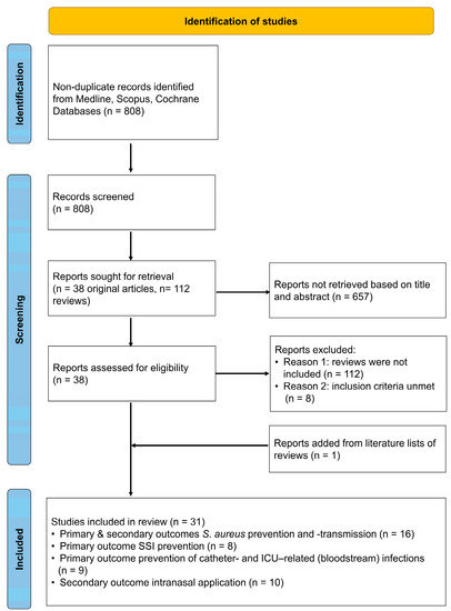 This review was performed considering the PRISMA guidelines [18]. We searched Medline, Scopus, and the Cochrane databases for the term “octenidine” without language or time restrictions (until 21 August 2022). Titles and abstracts of the identified articles were screened by assessing whether they met the entry criteria. A detailed description of the entry and exclusion criteria, as well as the process of data extraction, is shown in Table S1. The primary outcomes assessed in this review were (i) the efficacy of S. aureus decolonization or the incidence of S. aureus infections after treatment with OCT (alone or in combination with other substances), (ii) the incidence of SSIs (including all types of superficial and deep-seated SSIs), and (iii) the incidence of ICU- or catheter-related bloodstream infections and catheter insertion site infections. Secondary outcomes were the rate of nosocomial S. aureus transmission and effects of OCT (on decolonization, transmission and so on) when applied intranasally.