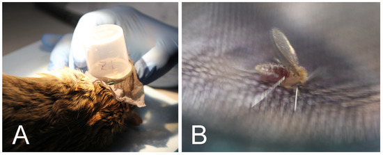 Xenodiagnosis. (A), Sand flies held in plastic tubes coated with nylon mesh on the pinna of M. shawi; (B), Detail of feeding female P. papatasi.