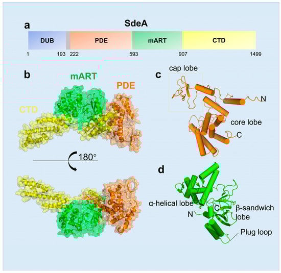 The SidE family protein contains four domains, including DUB, mART, PDE and CTD domains, and each one has its independent function or regulates another. The DUB domain, comprising ~200 residues in the N-terminus of SidE, was first characterized to have deubiquitinase activity, with a preference for Lys-63 Linked polyubiquitin chains []. The PDE domain spans residues approximately 200–600, which is formed by two lobes: a larger helical core lobe containing the catalytic pocket and a smaller cap lobe covering from the top [] (Figure 1c). Structural comparison revealed that human SAMHD1, the dNTP hydrolase related to innate immune response, is the closest structural homologue in mammals of SdeA []. The SdeA mART domain contains a typical Rossmann fold and shows the conserved characteristics among all known mART toxins in bacteria []. Two-lobe structures constitute the SdeA mART domain, one with an N-terminal α-helical lobe and the other with a C-terminal β-sandwich lobe (Figure 1d). Even though the similarity between SdeA mART and other mART toxins exist, there are some weak differences in structural details. For example, the PN loop and ARTT loop in the mART domain are different from those of other mART proteins. Moreover, the plug loop, two consecutive helices connected by a loop, inserts into and interacts with the PDE domain, which is related to the activity of mART but not to the PDE domain [].