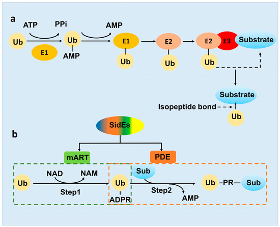 As mentioned above, ubiquitination as an important protein PTM, was well studied for decades []. However, in 2016, SdeA protein in L. pneumophila was identified to be capable of performing a non-canonical ubiquitination by itself []. In contrast to the conventional ATP-driving E1-E2-E3 cascade (Figure 2a), the ubiquitination catalyzed by SdeA effector requires NAD+ as energy []. Overall, it is strikingly different between the three-enzyme systems and the all-in-one ubiquitination machinery SidE. While SidE family protein comprises four domains, only the enzymatic activities of the PDE and mART domain are involved in the ubiquitination process. The SidE ligase machinery was divided into two distinct parts, Ub activation and Ub-substrate ligation, which was catalyzed by the mART and PDE domain respectively (Figure 2b) [].