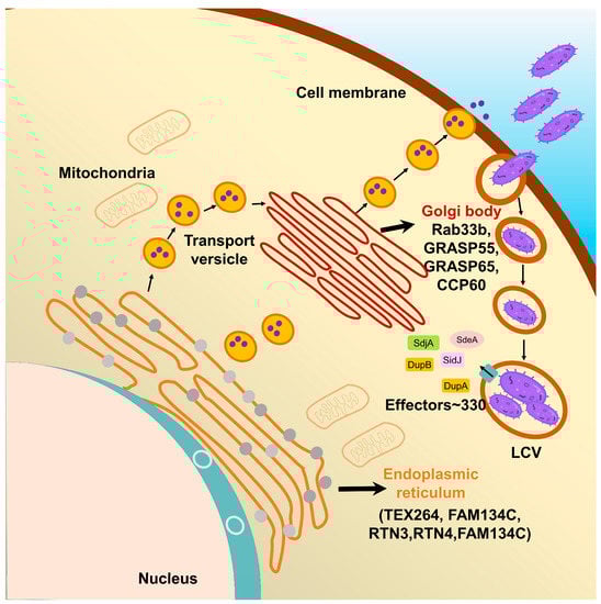 In the early stage of infection, L. pneumophila exploits effectors, such as SidE family proteins, to manipulate Rab1 and other ER-related proteins to intercept the versicles to the LCV []. Actually, the downstream process after ER vesicles fusing to the Golgi complex is also disturbed. Recently, the relationship between PR-ubiquitination and the Golgi complex has received increasing attention. The Golgi complex, the cystic structure apparatus formed by the elementary membrane, is the component of the eukaryotic endomembrane system, which functions as the PTM factory for protein modification, classification and translocation []. The vesicles from the endoplasmic reticulum could fuse with the Golgi membrane, delivering the inclusions into the Golgi lumen, where the newly synthesized peptide chains continue to complete their modification and packing [].