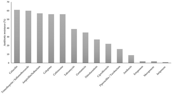 The antibiotic resistance of the 93 K. pneumoniae strains is shown in Figure 2, in which it can be observed that the higher percentage of resistance belongs to AMP. On the other hand, 60% of the population (56/93) was classified as ESBL-producing strains.
