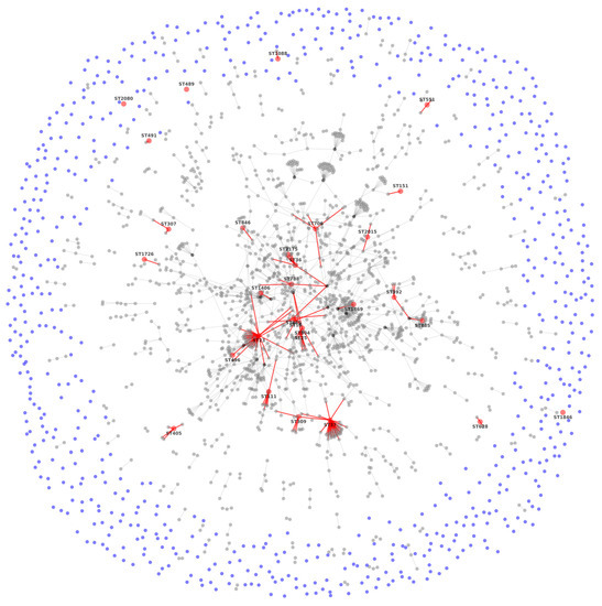 Snapshot population of the isolated K. pneumoniae. eBURST comparative analysis. Nodes without interaction are shown as blue dots; nodes with a value of interaction greater than 10 are shown in black. The STs identified in this study together with their interactions with the closest nodes are shown in red.