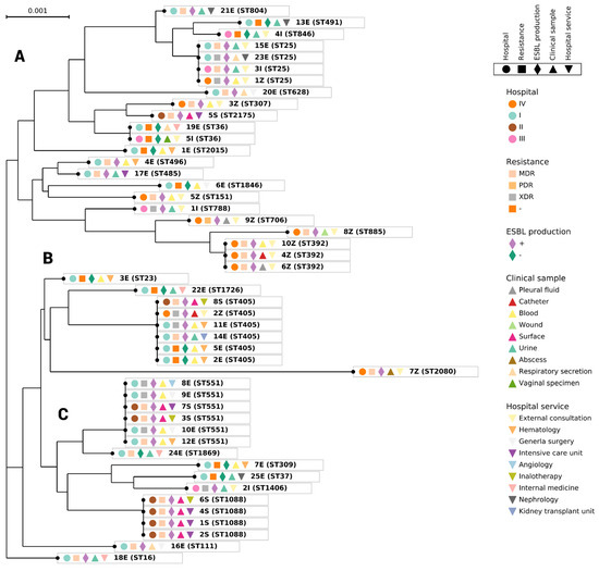 The multiple sequence alignments (MSAs) and phylogenetic tree of the multilocus sequence including the gapA, InfB, mdh, pgi, phoE, ropB, and tonB genes, were generated using the Next Generation Phylogeny.fr web service available at https://NGPhylogeny.fr [18] (accessed on 24 March 2023). We used the “One-Click Workflow” tool from NGPhylogeny.fr, which offers a customizable platform for phylogenetic analysis and MAFFT (Multiple Alignment using Fast Fourier Transform) [19]. The MAFFT alignment was curated using BMGE (Block Mapping and Gathering with Entropy) [20] and FastME (Fast Minimum Evolution) [21] was used to produce the tree file. FastME uses distance algorithms to infer phylogenies. The newick file was processed in a Python v3.6.7 environment through the platform Jupyter Notebook v6.0.3 and the final tree was generated by an in-house python script using the Matplotlib v3.0.3, Pandas v1.0.4 and Biopython v1.79 packages. In addition, information associated (hospital, resistance, ESBL production, clinical sample, hospital service) with the strains illustrated in the phylogenetic tree was added.