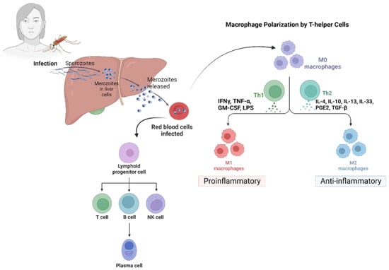 Malaria’s pre-erythrocytic and blood stages are initiated when a female Anopheles mosquito carrying the malaria parasite feeds on human blood [40,55]. Post mosquito bites, sporozoites are discharged into the victim’s dermis and enter into the bloodstream, where they must surpass Kupffer cells (KC) and endothelial cells (EC) to invade the hepatocytes and start an infection [55,56]. Sporozoites can also pass through the gaps between EC and KC by modulating cytokinin activity, upregulating anti-inflammatory Th2 cytokines, and downregulating inflammatory Th1 cytokines [57,58]. Additionally, sporozoite-produced circumsporozoite protein (CSP) can interact with KC surface proteins, namely LRP-1 (low-density lipoprotein receptor-related protein) and proteoglycan, and inhibit ROS production by producing intracellular cAMP/EPAC [58]. Notably, the sporozoites induce KC apoptosis, while the CSP reduces KC-specific expression of MHC-1, decreasing its antigen presentation capability [59]. Thus, the sporozoites can effectively minimize KC functions and make their entry into liver hepatocytes [39].