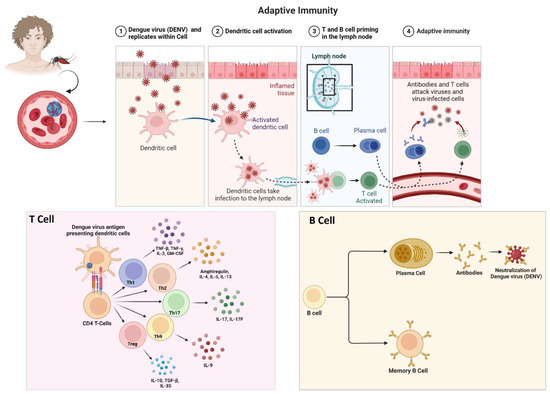 The adaptive immune responses combine forces to fight the dengue virus. B cells produce antibodies that specifically recognize and neutralize the foreign viral particles, and cytotoxic T cells recognize and kill cells that are infected with the dengue virus.