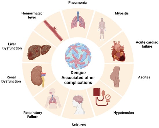 Neurological disorders: In 2009, the World Health Organization (WHO) categorized several neurological disorders, including encephalopathy, encephalitis, dengue muscle dysfunction, and neuro-ophthalmic disorders, as potential complications resulting from severe dengue infection. A case study conducted in Brazil involving 150 patients with severe dengue infections reported diverse neurological symptoms. Additionally, DENV particles were detected in 48.8% of dengue-positive cases, thus providing further evidence linking neurological changes with DENV infection. Clinical manifestations of infection, such as meningitis (19.5%), encephalitis (46.3%), and meningoencephalitis (34.1%), were common [199]. The neuro-pathogenesis of DENV infection can be correlated with the presence of viral particles in cerebrospinal fluid (CSF) and damage to the blood–brain barrier (BBB) [200]. Dengue viruses are also reported to infect various immune cells and murine neuronal cells directly [201]. Recent studies have suggested the role of DENV NS1 antigen in triggering macrophages via TLR4, leading to the release of proinflammatory cytokines such as TNF-α, IL-12, and IL-4 and damaging the blood–brain barrier [202]. Strokes associated with DENV infection, either ischemic or hemorrhagic, are uncommon but not absent. Hemorrhages result from plasma leakage and vasculitis, but the bleeding is mainly intracranial [203]. Several studies also reported parkinsonism associated with DENV infection, mainly after recovery from acute illness. Patients developed symptoms such as bradykinesia, bradyphonia, and cogwheel rigidity, which could result from immune-mediated reactions [204]. In a prospective case-control study on 5400 children admitted with dengue hemorrhagic fever in Vietnam, 27 showed features of neurological syndromes. Seizures were reported in nearly 77% of individuals with clinical neurological manifestations [205]. Autoimmune conditions of neuromyelitis optica spectrum disorder (NOSD) were reported in two dengue-infected patients with aquaporin 4 antibodies in their serum [206]. Similarly, autoimmune conditions such as acute disseminated encephalomyelitis (ADEM) are also found among dengue-related neurological disorders. The most common manifestation was altered consciousness, followed by seizures and vision problems. The pathophysiology of this autoimmune reaction is unknown, but an auto-reactive attack on myelin could be due to imbalanced T cell tolerance [207] (Figure 4).