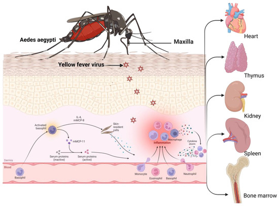Immunity at the skin level is a crucial first line of defense against pathogen invasion. This is especially true for vector-borne diseases such as malaria, dengue, chikungunya, yellow fever, Zika virus infection, Rift Valley fever, Japanese encephalitis, and West Nile virus infection. Post-pathogen entry via mosquito bite into host skin, the immune response at the skin level plays a vital role in preventing the establishment of the infection [34]. This response involves activating local immune cells, such as dendritic cells, macrophages, and natural killer cells, which recognize and eliminate pathogens. The skin also contains antimicrobial peptides and proteins that can kill or neutralize invading pathogens [34]. The skin’s immune response is complex and can be modulated by various factors, including age, sex, and previous exposure to the pathogen. Understanding the skin’s immune response to these vector-borne pathogens is critical for developing effective preventive and therapeutic strategies. In the case of malaria, the sporozoites are blocked at the dermis and gradually removed by phagocytic cells. SPECT-1 (sporozoite microneme protein essential for cell traversal) and SPECT-2 (perforin-like protein 1) proteins are used by these sporozoites to avoid dermal blockade and phagocytic ingestion by immune cells [35]. Numerous mosquito-borne viruses, such as DENV and WNV, actively replicate in migratory Langerhans cells (LCs), thereby indicating that this ability might be a desirable method inside vertebrate hosts [36]. Different receptors have been found or suggested as entry points for DENV, which enters the cell through receptor-mediated endocytosis. It has been demonstrated that DENV can be bound in vitro by heparin sulfate, proteoglycan, and glycosaminoglycans, which are frequently expressed on different mammalian cell types [37].
