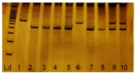 Electrophoretic profile of APOBEC3A/B polymorphisms. Ld: 100 bp molecular standard; 2, 3, 4, 5, 7, and 8 homozygous for wild-type allele (490 bp); 9 and 10 heterozygous (490 bp and 700 bp) and 1 and 6 homozygous for variant allele (700 bp).