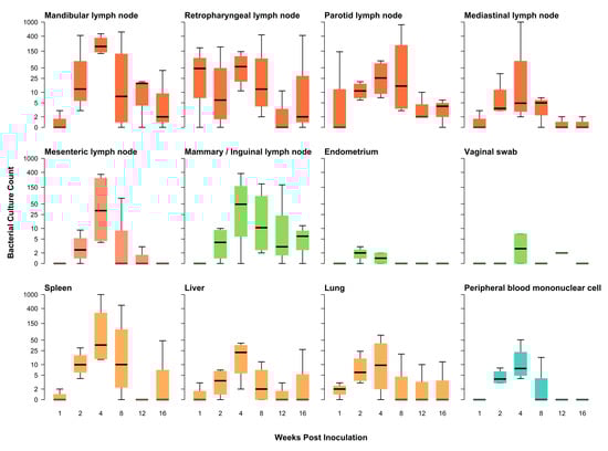 There were no statistically significant differences among males and females, adults and subadults, or the laboratory-propagated strain and wild-type field isolate in terms of the type and number of tissues infected (Table S1, Table S2, Table S3, respectively). Vaginal swabs were frequently contaminated with other commensal bacteria; however, two female pigs (17%) had detectable B. suis from vaginal swab. B. suis was only detected in the endometrium of 25% of animals, and none after 4 wpi. B. suis was detected in the mammary and inguinal lymph nodes at all time points in 61% of animals. The testes of the single uncastrated male were culture-negative. Cranial lymph nodes (parotid, mandibular, retropharyngeal, mediastinal) were the most likely tissue to be infected with detectable B. suis, observed in 61-78% of animals, and up to 50% of animals at 16 wpi had detectable B. suis in these tissues. Caudal lymph nodes (mesenteric) were less likely to be infected, with only 39% of animals having detectable B. suis observed and none with detectable B. suis after 12 wpi. Organs (lung, liver, spleen) had detectable B. suis in 52–57% of animals and occurring at all time points.