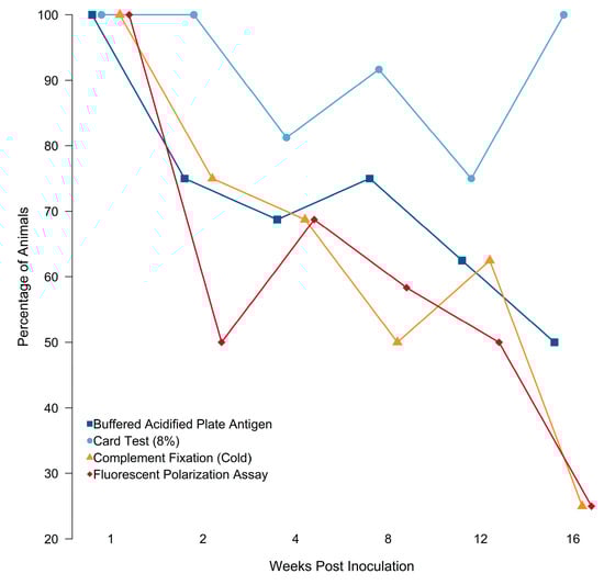Pre-challenge B. suis serological diagnostics were negative for all animals. All animals (100%) had positive serological results at 1 and 2 wpi on at least one assay. Animals with detectable antibodies against B. suis declined to 81.3%, 91.7%, and 75% at 4, 8, and 12 wpi, respectively. All animals (100%) had detectable antibodies at 16 wpi. These serologic results demonstrate substantial heterogeneity between samples collected from the same animal and at the same time point post-inoculation (Table 1, Figure 2). The capacity of serological assays to detect antibodies against B. suis declined from 1 to 16 wpi for all assays except the card test (Figure 2). Assay capacity to detect antibodies against B. suis declined at an average weekly rate of 7.2% (BAPA), 0.45% (card test), 9.0% (CF), and 10.2% (FPA). Two subjects had serological results that were anomalous. Subject 729 (euthanized at 12 wpi) was seropositive at 4 wpi using the card test but was seronegative according to all of the other assays and culture-negative at the time of euthanasia (Table 1, Figure 2). The second anomalous subject was 732, euthanized at sixteen weeks post-infection; this animal was seropositive on the card test at 8, 12, and 16 wpi but was culture negative at the time of euthanasia.