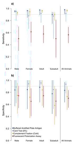 Disease surveillance systems are an important element of the animal health infrastructure used to detect and respond to disease events. Wildlife play a significant role in the dynamics of many economically important diseases, and are an increasingly crucial component of associated surveillance efforts [,,]. Despite the importance of wildlife, challenges persist in implementing effective surveillance programs in wild populations [,]. One of the most important limitations is diagnostic tools, which are often unvalidated in wildlife []. Diagnostic tools designed to screen for infectious diseases in domestic animals frequently do not have the same levels of sensitivity and specificity when used in wild species []. This can complicate interpretation of surveillance results, reducing the sensitivity of the surveillance system.