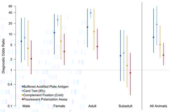 Diagnostic odds ratio for the buffered acidified plate antigen test (BAPA), 8% card agglutination test (card test), fluorescence polarization assay (FPA) in tube format, and Brucella abortus/suis complement fixation (CF) test. An odds ratio close to 1 indicates that the assay provides no useful information and is equally likely to classify an animal as positive regardless of the true condition of the animal. The diagnostic odds ratios for adult animals tended to be higher compared to the other strata. The card test performed better than other assays, and performed significantly better for adult female animals. All assays had low diagnostic odds ratios for subadult animals. FPA had the lowest performance for subadult animals.