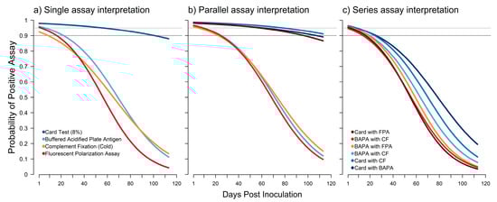 All logistic models demonstrated generally good predictive capacity (Table S7). The probability of a positive test result after inoculation declined for all assays used in the study (Figure 5a). When using a single assay, only the card test maintained a detection probability above 0.95 after inoculation, and its detection probability remained above 0.90 until 101 days post-inoculation. Interpreting assays in parallel increased the detection probability (Figure 5b). Combinations that included the card test had probabilities of detection above 0.95 until 59 to 79 days post-inoculation. Interpreting assays in series reduced the probability of detection for all assay combinations. When interpreted in series, none of the assay combinations achieved a probability of detection above 0.90 after 8 days post-inoculation (Figure 5c).