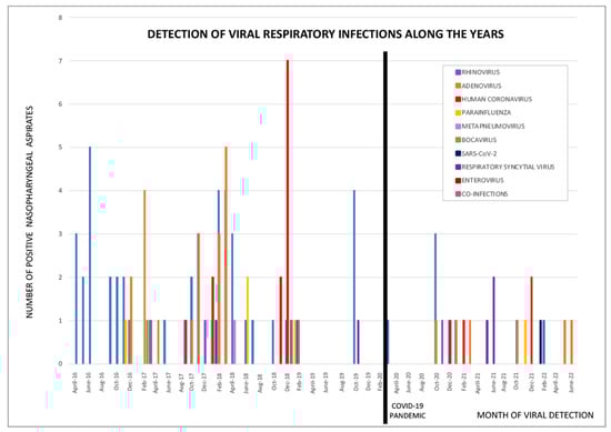 During the pre-COVID-19 period, 1589 NPAs were collected, yielding 8.9% positive results. The median number of samples per patient was six (IQR 4.5–9). Ninety-three infants (39% of the pre-COVID-19 cohort) had at least a positive sample. The most frequently isolated species were hRV (49.5%), followed by AdV (22.6%), and HCoV (12.9%). Positive NPA occurred in clusters during the autumn and winter seasons.