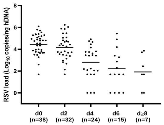 For each patient, nasopharyngeal aspirates (NPA) were collected at different time points, in particular upon admission (day 0, d0) and every 48 h during hospitalization until discharge (d2, d4, d6, d8, and so on). On the NPA collected at admission, the direct diagnosis of respiratory viral infection was performed by the laboratory of virology. In particular, the antigens of the eight most common respiratory viruses were detected by direct immunofluorescence assays: RSV, influenza virus A and B, parainfluenza virus 1–3, and adenovirus were identified by the SimulFluor® Respiratory Screening kit (light diagnostics™ Chemicon Internacional, Temecula, CA, USA), while metapneumovirus was detected by human metapneumovirus direct immunofluorescence assay (light diagnostics™). In addition, since the spreading of the coronavirus disease 2019 (COVID-19) pandemic, according to our hospital procedures, universal pre-admission screening of SARS-CoV-2 testing during hospitalization was performed by molecular methods; no positive cases were observed. All the NPA samples were stored at −80 °C. For this preliminary analysis, NPA that resulted positive only for RSV were retrospectively analyzed for viral-load quantification. Briefly, nucleic acid extraction was performed by NucliSENS® easyMag® instrument (bioMérieux, Marcy-l’Étoile, France), according to the manufacturer’s instructions (initial volume of 200 µL of each NPA eluted in 50 μL). The reverse transcription and quantitative amplification of the viral target (gene matrix) were performed by a home-made quantitative real-time TaqMan PCR (RT-qPCR). The reaction was carried out at a total volume of 10 µL containing 4 µL of 2.5× Universal Master Mix (DiaSorin, Saluggia, Italy), 0.5 µL of Reverse Transcriptase (DiaSorin, Saluggia, Italy), 0.2 µL of control primer pair (SimplexaTM Extraction and Amplification Control Set-RNA, DiaSorin), 0.2 µL of RSV (Respiratory Syncytial Virus) primer pair (DiaSorin, Saluggia, Italy), 0.1 µL of RNAse free water and 5 µL of the extracted sample. Thermocycling conditions were performed on LIAISON® MDX (DiaSorin, Saluggia, Italy) in a 96-well format as follows: 50 °C for 8 min, 97 °C for 2 min, followed by 40 cycles of 97 °C for 10 s, 56 °C for 30 s (data collection). A synthetic oligonucleotide (such as gBlocks® Gene Fragments, Tema Ricerca, Castenaso, Italy), 770 bp in length, of the matrix gene, was used to perform ten-fold dilutions and generate a standard curve. Before RT-qPCR, human DNA quantification in each eluted sample was performed using NanoDrop™ 2000 spectrophotometer (Thermo Fisher Scientific, Waltham, MA, USA). The RSV viral load was reported as log10 copies/ng human [h]DNA. For values under the lower limit of quantification (LLoQ) an arbitrary value of half of the LLoQ was assigned (1.6 log10 copies/ng hDNA), while negative samples were reported as 1 log10 copy/ng hDNA.