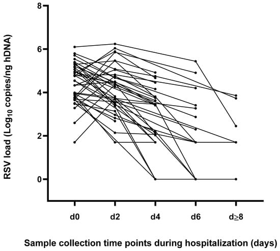Kinetics of viral replication represented as individual RSV load at different time points during the hospitalization period.