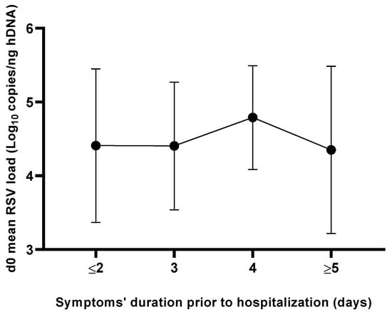 The overall mean time of symptom onset prior to hospitalization was equal to 3.5 ± 2.2 days and no statistically significant difference (p = 0.87) was observed when comparing the mean RSV load values detected at the d0 time point stratified according to the beginning of symptoms (Figure 3).