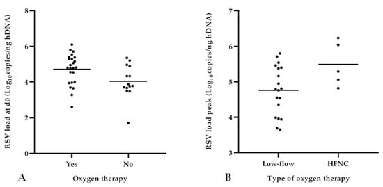 Analysis of RSV load in relation to need and type of oxygen therapy. Higher viral loads detected at admission (d0) in patients needing oxygen therapy (p = 0.03) (A); higher RSV load peak values reached within 48 h from admission detected in patients treated with HFNC (p = 0.04) (B).