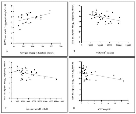 As detailed in Figure 5a, a positive correlation between the RSV-RNA levels at d0 and the duration of oxygen therapy was found (r 0.42, p = 0.04), although no significant differences emerged when patients were dichotomized on 72 h cut-off (as shown in Table 1), which was chosen by considering the mean time duration of oxygen therapy. On the contrary, a negative correlation was observed when evaluating the RSV load peak in association with the total WBC and the lymphocyte cell count as well as the CRP values (r −0.35, p = 0.03; r −0.34, p = 0.04; r −0.40, p = 0.01, respectively), as shown in Figure 5b–d.