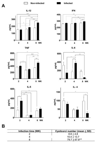 In contrast, in infected groups, a significant increase at 2 weeks was observed, which gradually decreased its levels by half at week 8, whereas IL-4 maintained basal levels at 2 and 4 weeks in non-infected and infected groups, but its levels decreased by half at week 8 in the infected group. Figure 1B shows the average number of cysticerci increased during infection. In week 2, an average of 8.8 cysticerci, in week 4 of 15.4, and in week 8 of 79.9, were recorded.