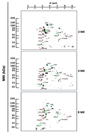 Representative 2DE proteomics profiles of T. crassiceps cysticerci in infected mice at 2, 4, and 8 weeks (WK). Molecular weight (MW) and isoelectric point (IP) are indicated in kDa and pH, respectively. The arrows and numbers indicate the spots of proteins with a differential expression between 70% and 100% and sequenced by MALDI-TOF MS. TPI was used as a constitutive protein (black arrow). Red arrows show group 1, and green arrows show spots of group 2.