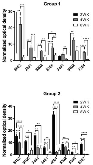 Profiles of the differential expression of proteins by T. crassiceps cysticerci at 2, 4, and 8 weeks (WK) post-infection. Two groups were identified: Group (1) low expression at 2 weeks that increased at the 4th week and decreased on the 8th week, and Group (2) high expression at 2 weeks that decreased at 4 and 8 weeks, the last being the lowest. Significance of * p < 0.05; ** p < 0.01; *** p < 0.001; **** p < 0.0001.