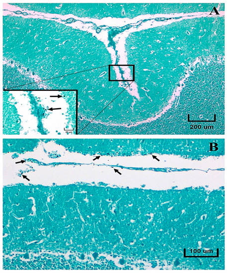 Human cerebellar cortex and sulci with leptomeninges (arachnoid and pia mater). Note the presence of yeast cells on the cortex surface and adhered to leptomeninges ((A), inset, arrows). Numerous yeast cells adhered to the same structures in other parts of the cerebellum ((B), arrows). Grocott methenamine silver stain.