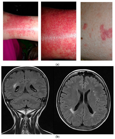 The virus replication in peripheral blood mononuclear cells may be etiologically implicated in B-cell clonal proliferative disorders such as mixed cryoglobulinemia and non-Hodgkin’s lymphoma [78]. HCV infection is considered to be the main cause of mixed cryoglobulinemia, especially type II. Various studies have reported between 10% and 60% of HCV-infected patients with cryoglobulinemia, which is nearly always asymptomatic [79,80]. In thalassemia, cryoglobulinemia-associated symptoms such as asthenia, arthritis, and proteinuria are very common and may have a variety of causes, making them difficult to attribute to cryoglobulinemia. In 1995, a study to determine the incidence of cryoglobulinemia and associated symptoms in 264 HCV-positive transfusion-dependent thalassemia patients from Sardinia found the presence of cryoglobulins in 25.8% of cases [81]. A high prevalence of cryoglobulinemia (28.6%) in that same population was confirmed many years later [70]. Only one patient presented with symptoms clearly attributable to the disease: repeated episodes of lower limb purpura with severe arthralgia and painful peripheral neuropathy confined to the lower limbs with predominant sensory impairment (Figure 1a) and a magnetic resonance imaging suggestive of cerebral vasculitis (Figure 1b).