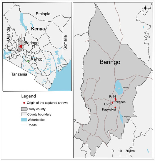 The sampling of peridomestic rodents and shrews was performed in diverse ecologies along the Rift Valley in Kenya (Figure 1). These were Marigat (0.4695° N, 35.9833° E) in Baringo County and Nguruman (1.7617° S, 36.0255° E) in Kajiado County, both semi-arid areas with diverse populations and high human/livestock/wildlife interactions [41]. The two ecologies are both inhabited by semi-nomadic agro-pastoralist communities, who keep livestock and grow maize, millet, and fruits in irrigated farmlands. The availability of these foods supports rodent populations.