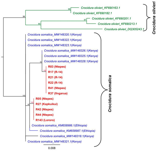 Phylogenetic relationship of the CytB gene sequences detected in this study. ML phylogenetic analysis, based on the 500 bp partial sequence of the CytB gene and other sequences from Crocidura somalica and Crocidura olivieri (outgroup) obtained from the GenBank, were aligned using MAFFT and the tree inferred using PhyML v. 2.2.4 with GTR substitution models employing 1000 bootstrap replicates. All the sequences generated from the shrews in this study are shown in red (GenBank and the accession numbers: OQ709089–OQ709099). Taxon names include the species designation, Genbank accession number, and country (in brackets).