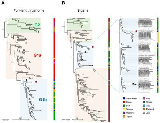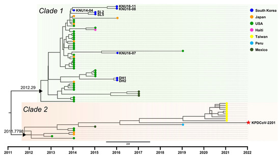 - Hsueh, F.-C.; Wu, C.-N.; Lin, M.Y.-C.; Hsu, F.-Y.; Lin, C.-F.; Chang, H.-W.; Lin, J.-H.; Liu, H.-F.; Chiou, M.-T.; Chan, K.R.; et al. Phylodynamic analysis and spike protein mutations in porcine deltacoronavirus with a new variant introduction in Taiwan. Virus Evol. 2021, 7, veab096. [Google Scholar] [CrossRef] [PubMed]