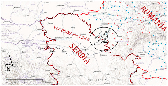 Geographical location of the hunting ground “Vršačke planine” in Vojvodina Province. Legend: red dots represent confirmed ASF outbreaks in domestic pigs in Romania; blue dots represent confirmed outbreaks in wild boars in Romania [21,22].